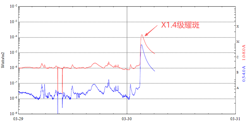 图2  2026年3月30日GOES卫星监测的X1.4级耀斑爆发(世界时)