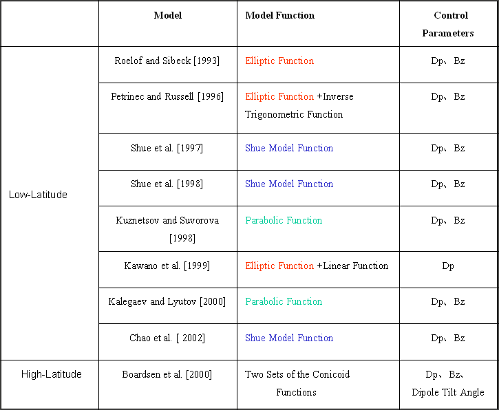 The Earth’s magnetopause is the result of the interaction between the supersonic solar wind and the Earth’s magnetic field. It basically separates the interplanetary magnetic field from the Earth’s magnetic field and prevents most solar wind plasma from entering the Earth’s magnetosphere. It adjoins the low-latitude boundary layer, the entry layer, the cusp and the plasma mantle [Eastman et al., 2000; Phan et al., 1997]. It is also the place where the reconnection occurs with the mass, energy and momentum transfer from the magnetosheath into the magnetosphere. ![]() Previous theoretical and statistical studies indicate that the global structure of the magnetopause is greatly influenced by the solar wind plasma and the interplanetary magnetic field. Under varying solar wind conditions, the magnetopause subsolar distance, r0, can be changed from 5.2 Re to 14 Re [Kuznetsov and Suvorova, 1998]. When r0 is less than 6.6 Re, geosynchronous satellites may cross the magnetopause and experience anomalies such as attitude and angular momentum control distortion [Shue et al., 2001]. Therefore, the prediction of the magnetopause size and shape is important not only for theoretical research and numerical simulation, but also for space weather applications. ![]() Various empirical magnetopause models have been developed in the past decades [Fairfield, 1971; Howe et al., 1972; Holzer and Slavin, 1978; Formisano et al., 1979; Petrinec et al., 1991; Sibeck et al., 1991; Roelof and Sibeck, 1993; Petrinec and Russell, 1993, 1996; Kuznetsov and Suvorova, 1996; Shue et al., 1997, 1998; Kuznetsov and Suvorova, 1998; Kawano et al., 1999; Boardsen et al., 2000; Kalegaev and Lyutov, 2000; Chao et al., 2002]. Most of them were developed mainly based on low-latitude magnetopause crossings with the rotationally symmetric assumption and parameterized by the solar wind dynamic pressure (Pd) and/or the interplanetary magnetic field (IMF) Bz. These rotationally symmetric models often use an elliptic function, a parabolic function or the Shue model function as a basic functional form to describe the magnetopause. In order to overcome the limit of an elliptic function, which must cross at some point on the nightside and can’t represent the distant tail magnetopause [Slavin et al., 1985], Petrinec and Russell [1996] used the inverse trigonometric functions to describe the nightside magnetopause and Kawano et al. [1999] used a cylinder to represent the tail magnetopause from the position where its transverse radius () reaches the maximum. The Shue model function has the flexibility to produce an open or closed magnetopause and has a reasonable extrapolation ability to predict the distant tail magnetopause. In addition, the saturation influence of southward IMF BZ on is also considered in the Shue et al. [1998] model and the Kuznetsov and Suvorova [1998] model. It is noted that the Petrinec and Russell [1996] model, the Shue et al. [1998] model and the Chao et al. [2002] model have an appropriate capability to forecast geosynchronous satellites crossing the magnetopause under extreme solar wind conditions [Yang et al., 2002]. For the high-latitude region, Formisano et al. [1979] constructed an average magnetopause size and shape in SM coordinates for two dipole tilt angle () values. Boardsen et al. [2000] developed a quantitatively empirical high-latitude magnetopause model parameterized by Pd, IMF Bz and for corrected GSM coordinates based on the northern hemisphere magnetopause crossings. Boardsen et al. [2000] did not fully model the three-dimensional magnetopause indentation due to the limitation of model functions. This model is only valid near the subsolar region and at high latitudes in the near-Earth region with XGSM ≥ -5 Re and not appropriate for the low latitudes away from the subsolar region. Obviously, these available magnetopause models are not very satisfactory to describe the global magnetopause structure, as shown in Figure 3, because of the limitation of their model functions. Fortunately, we found the advantage of Shue model function, and developed it into a three-dimensional global magnetopause model function, able to describe the asymmetries and the indentations of the magnetopause. Based on this model function, the magnetopause crossings from Geotail, IMP8, Interball, TC1, THEMIS, Wind, Cluster, Polar, LANL, GOES and Hawkeye, and the Levenberg-Marquardt fitting method, a new three-dimensional asymmetric magnetopause model was developed for corrected GSM coordinates and parameterized by the solar wind dynamic and magnetic pressures (Pd+Pm), the interplanetary magnetic field (IMF) Bz, and the dipole tilt angle. The asymmetries of the magnetopause and the indentations near the cusps are appropriately described in this new model, as shown in Figure 4. In addition, the saturation effect of IMF Bz on the subsolar distance and the extrapolation for the distant tail magnetopause are also considered. In comparison with the previous empirical magnetopause models based on our database, the new model improves prediction capability to describe the three-dimensional structure of the magnetopause. It is shown that this new model can be used to quantitatively study how Pd+Pm compresses the magnetopause, how the southward IMF Bz erodes the magnetopause, and how the dipole tilt angle influences the north-south asymmetry and the indentations. ![]()