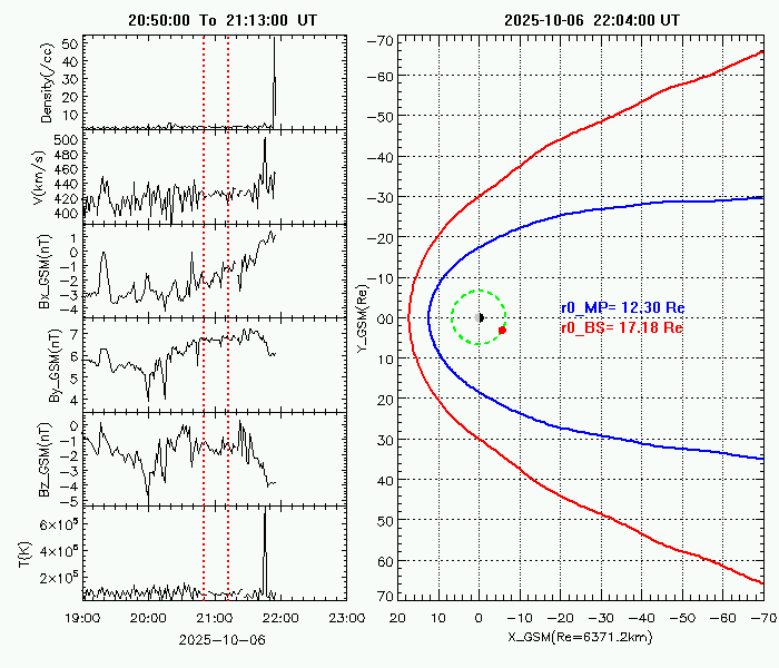 This page displays the empirically modeled Earth's dynamic magnetopause (Lin et al. [2010]) and bow shock (Chao et al. [2002]) shapes driven by real-time solar wind parameters (up figure). Modeled magnetopause sub-solar distances (bottom figure) as well as geosynchronous magnetopause crossings (GMC, see the table) are also shown.